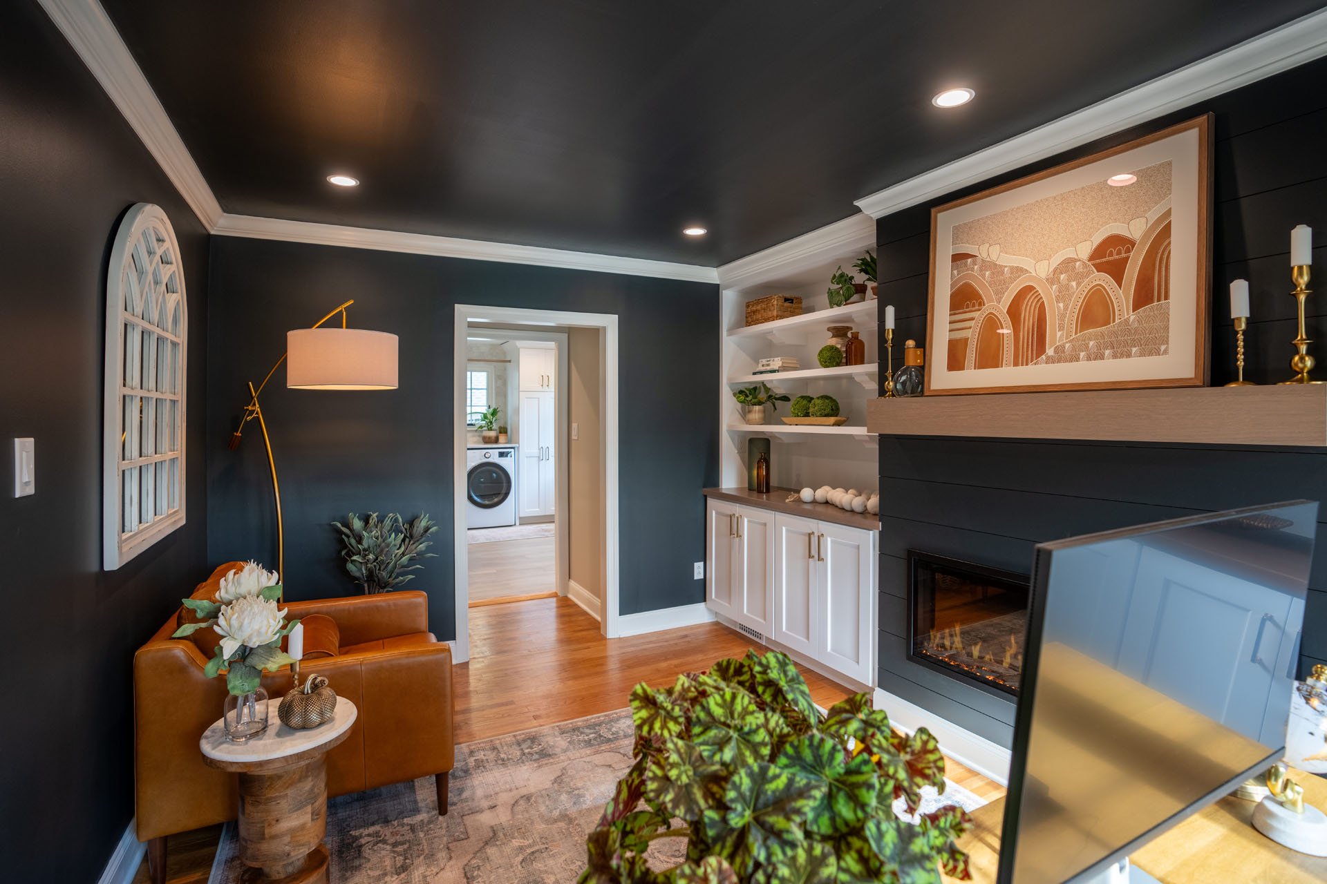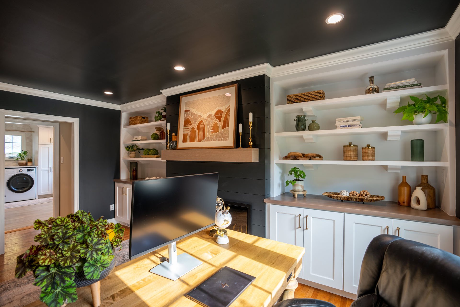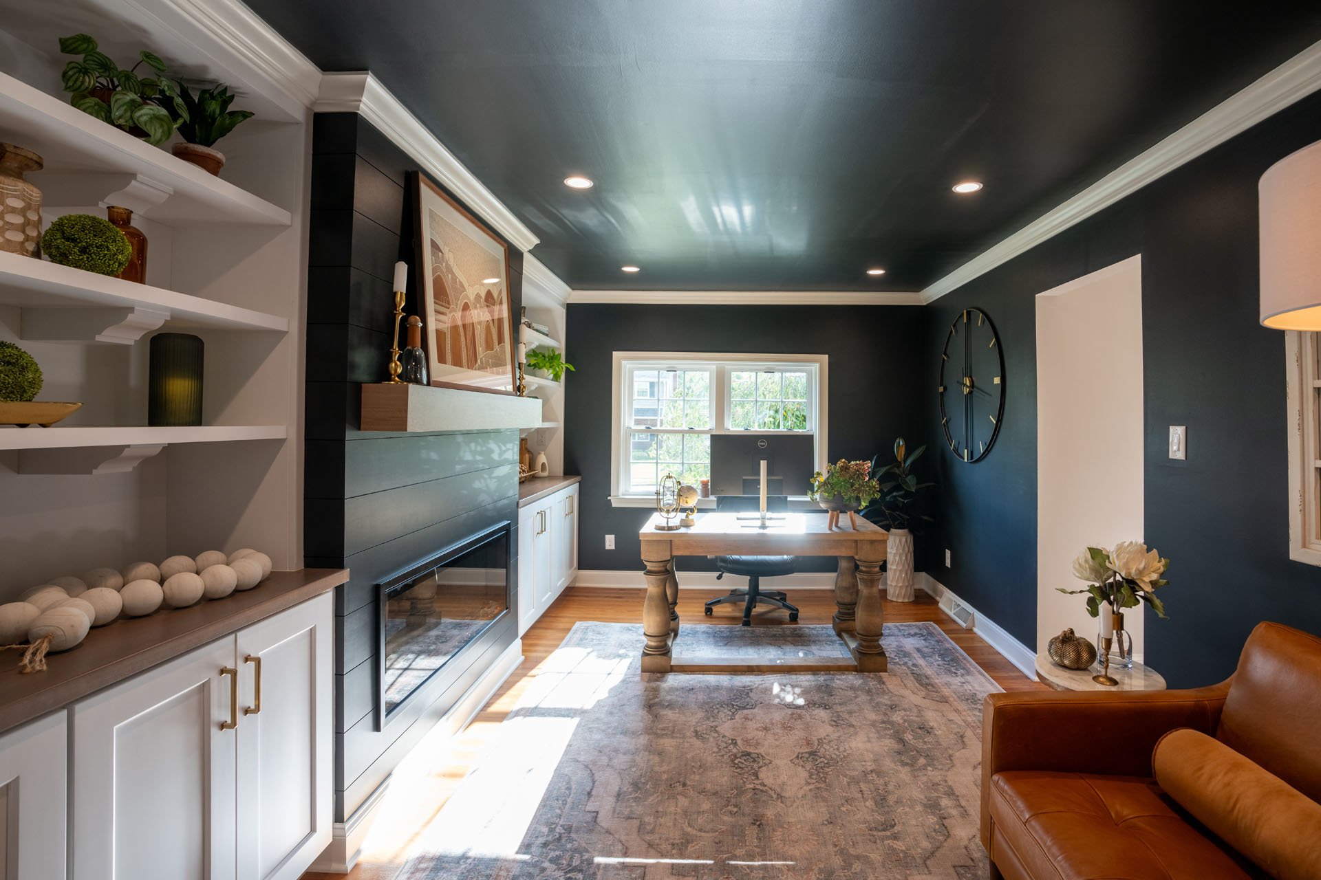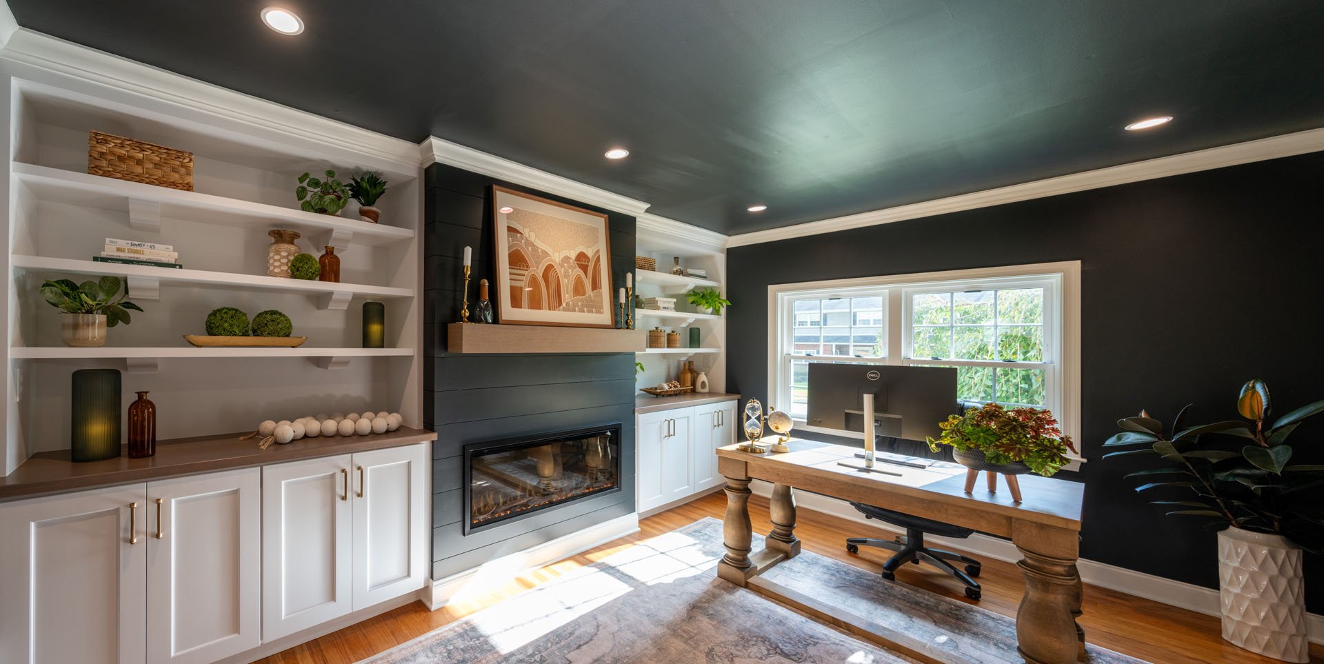 The stand-out design feature in this room is the striking contrast between the dark walls and ceiling and the white trim and built-in shelves. While this was a bold choice, the end result is both eye-catching and welcoming.