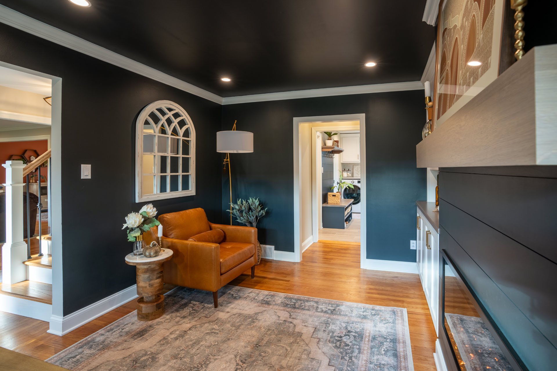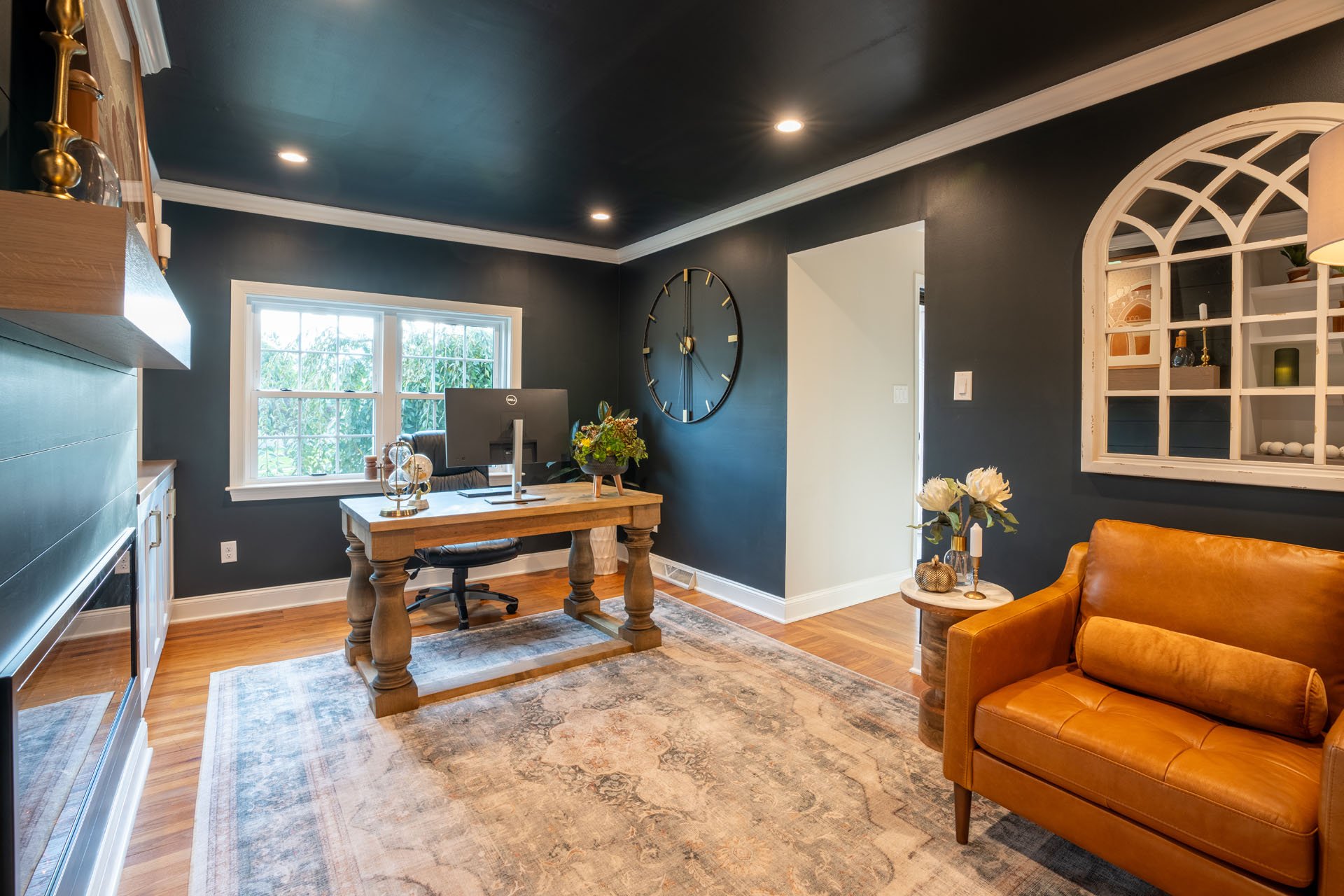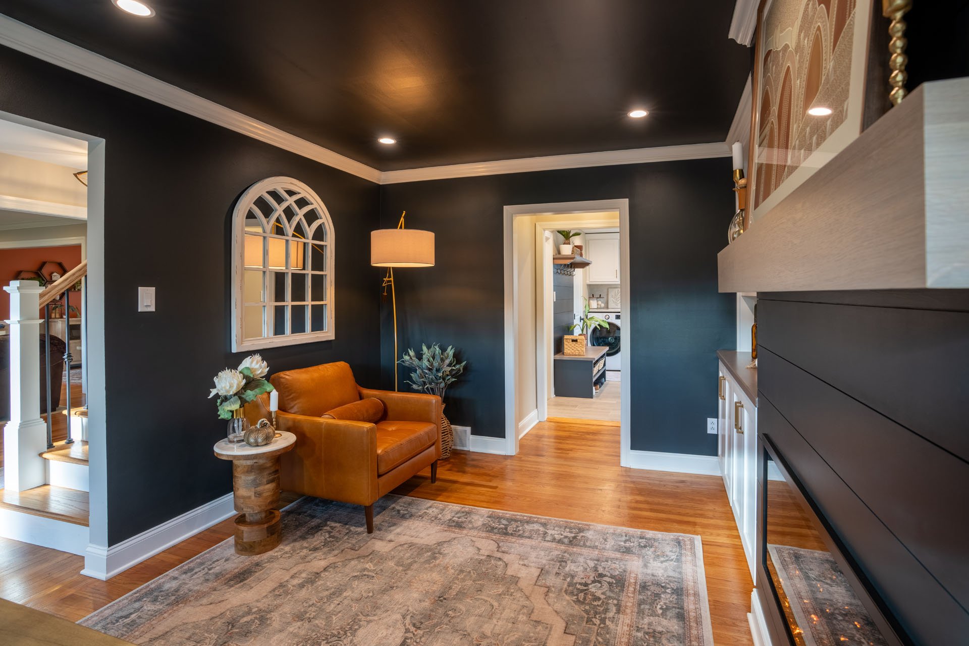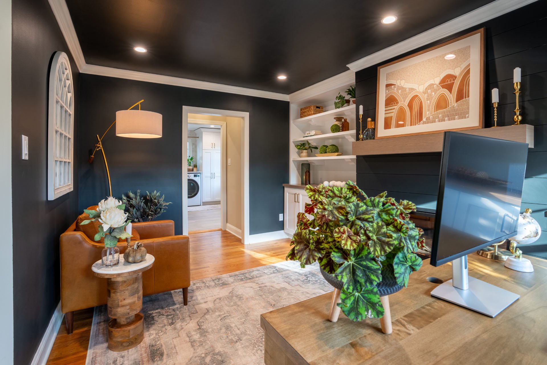 The stand-out design feature in this room is the striking contrast between the dark walls and ceiling and the white trim and built-in shelves. While this was a bold choice, the end result is both eye-catching and welcoming.
