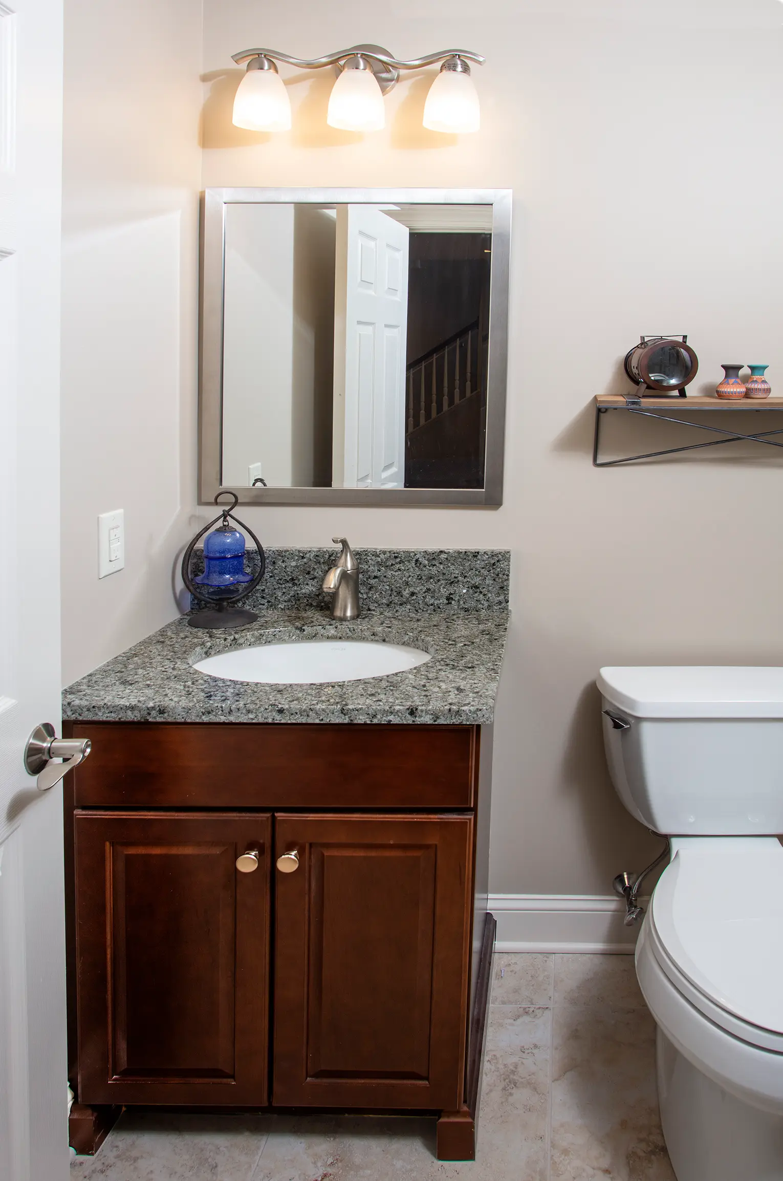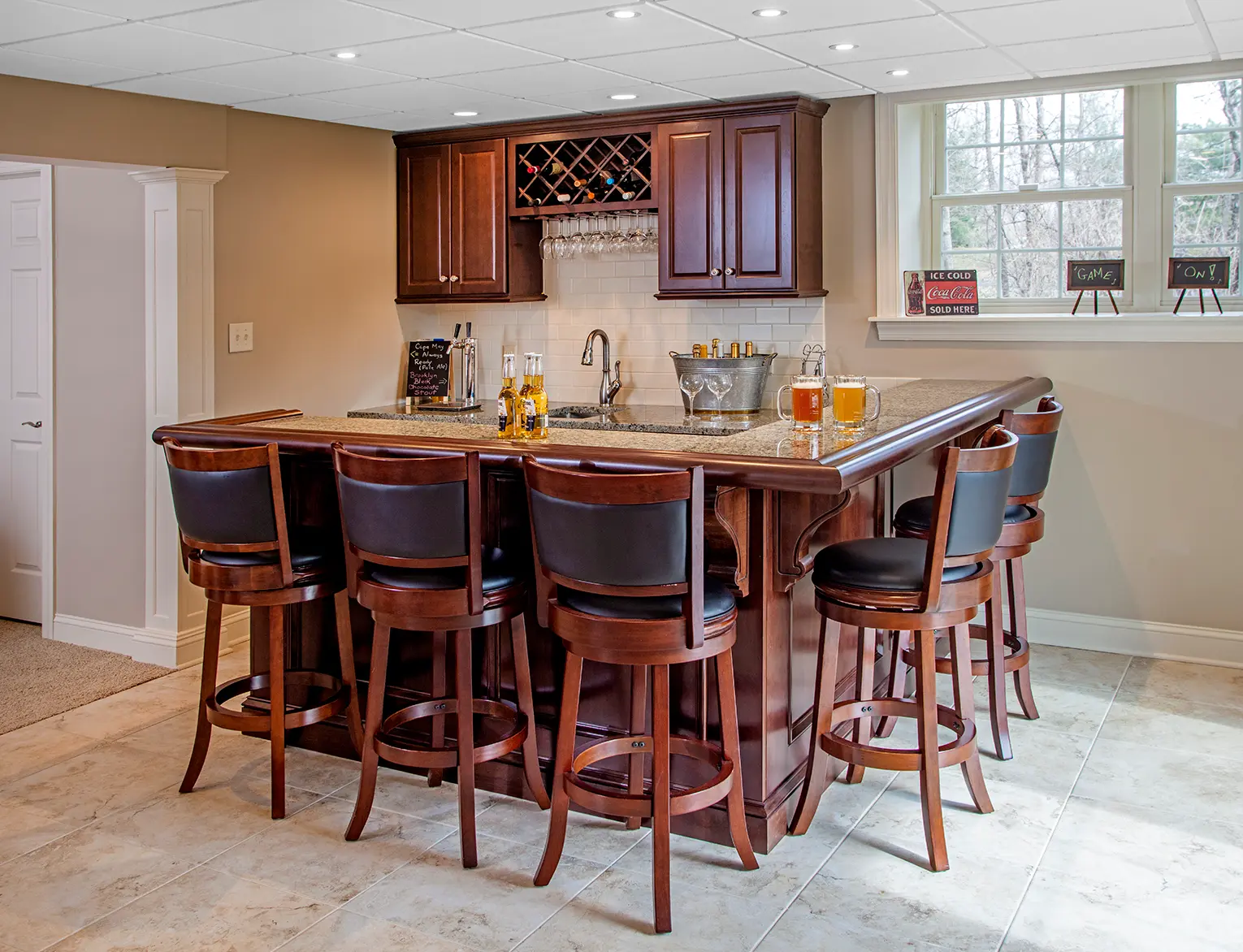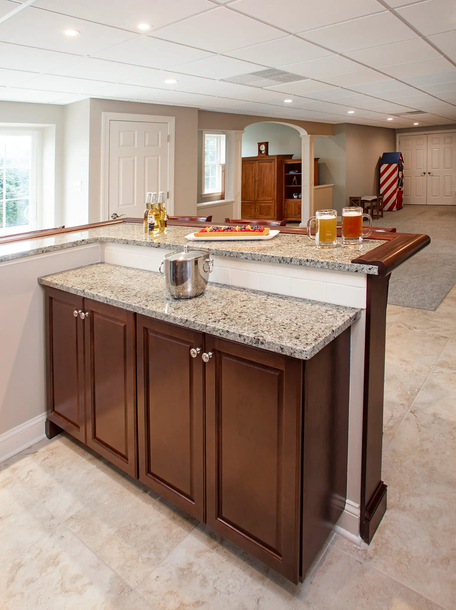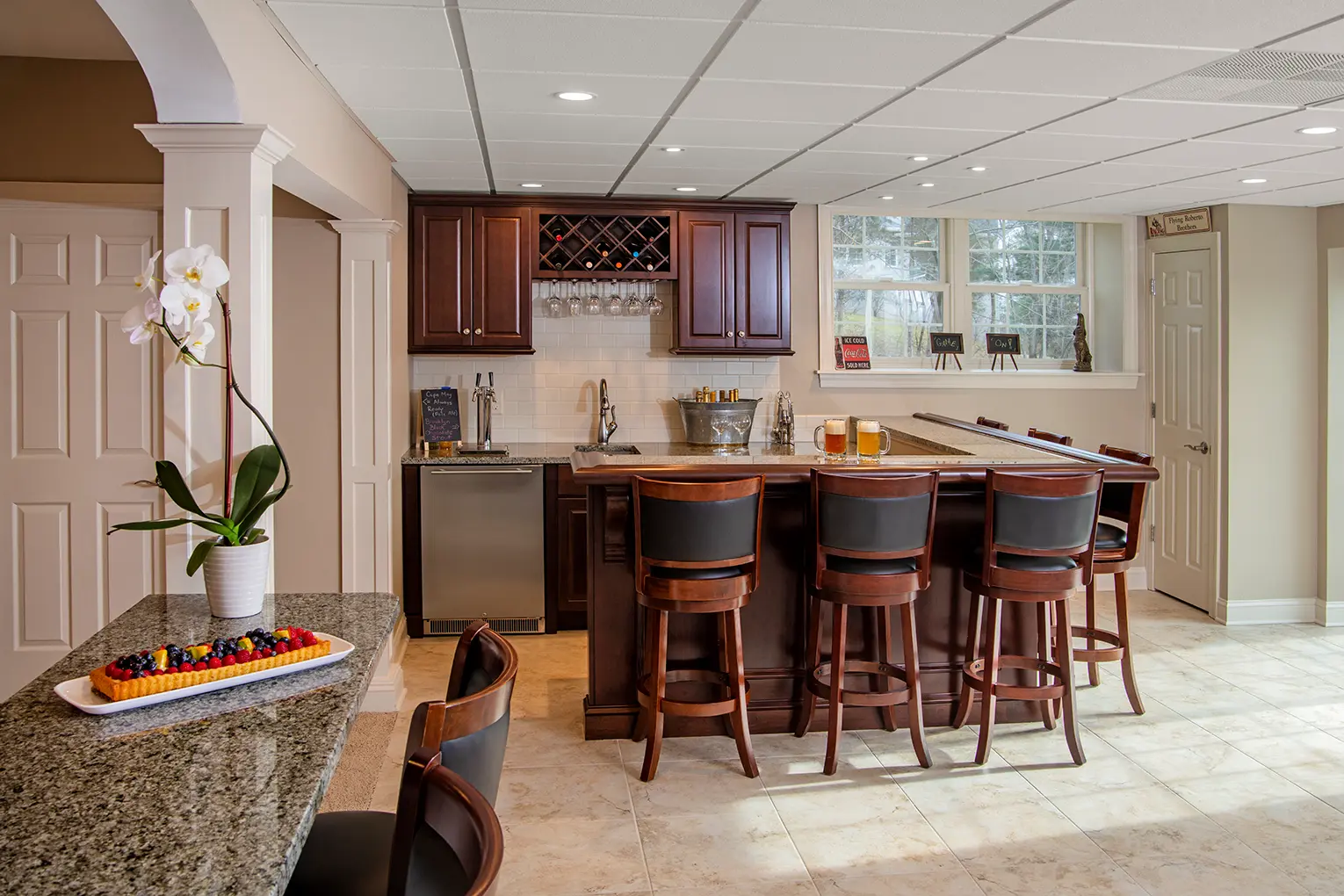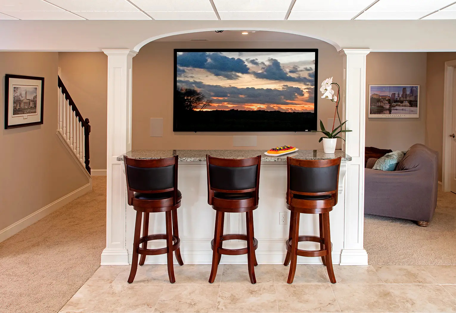 Our clients knew their basement had lots of potential. They wanted to transform it into a space where they could entertain, watch movies, have a craft area, all with a powder room on the lower level for convenience. They also needed a place for their workouts and equipment with sufficient room so it wouldn’t feel cramped. They also needed to preserve some of the space for storage and a place for their wine collection.