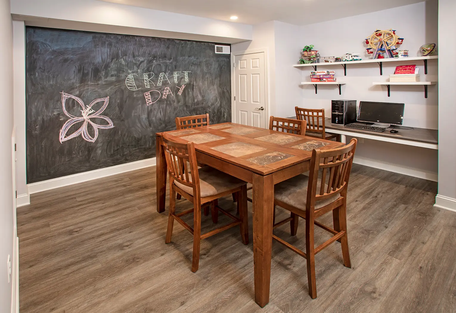 In the main entertaining space, there’s seating at a smaller counter in front of the big screen, while there’s room for more at the pub-style wet bar, which features cabinetry for storage, and under-counter refrigerator and kegerator. There’s a craft area for the kids, with a full wall of blackboard to let their chalk art creativity flow. There’s a finished play space under the stairs, and wine is stored in an unfinished area.