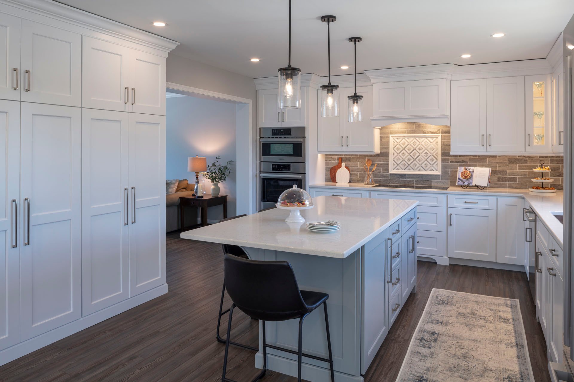 The Custom Craft team began by opening up the entire kitchen, dining room, and living room, leaving them with an open-concept floor plan that could accommodate all their needs. Their newfound space allowed for expansive new cabinets, including a full-wall pantry. Now, all appliances and cooking equipment can be stored in the kitchen where they belong. The new center island has even more storage, seating for four, and a built-in beverage unit so the kids can keep all their drinks cold without taking up room in the refrigerator.