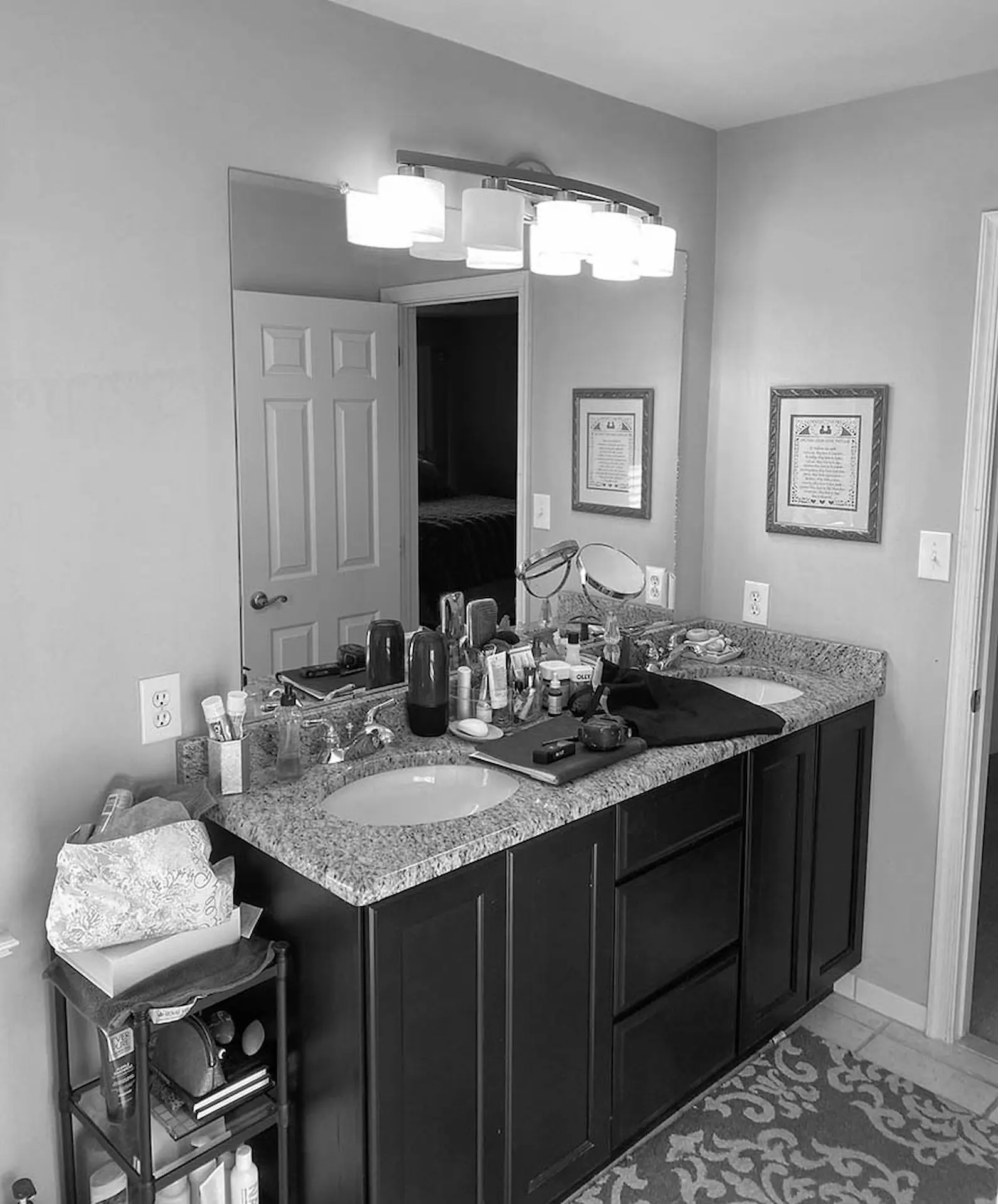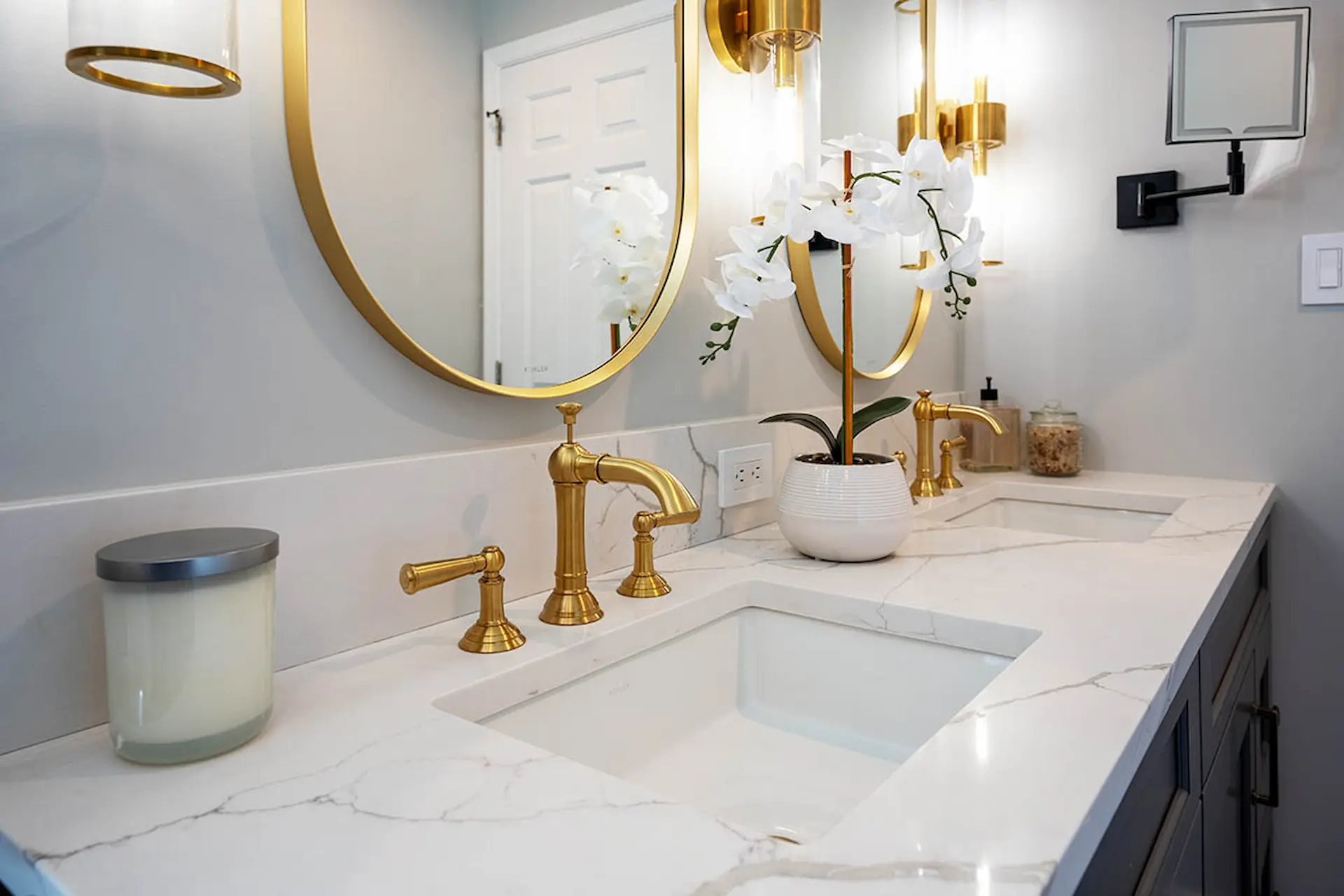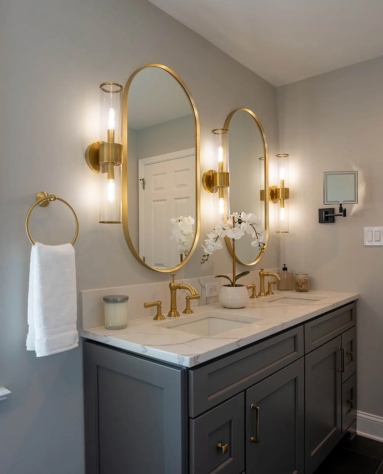 In addition, three cylindrical wall sconces are perfectly spaced between two lighted magnifying mirrors, combining flawless style and function. The new white quartz vanity top contrasts the warm, gray Legacy Crafted cabinets and looks fantastic with the honey bronze knobs. The dark and light theme continues throughout the space with white walls and charcoal matte floor tile.