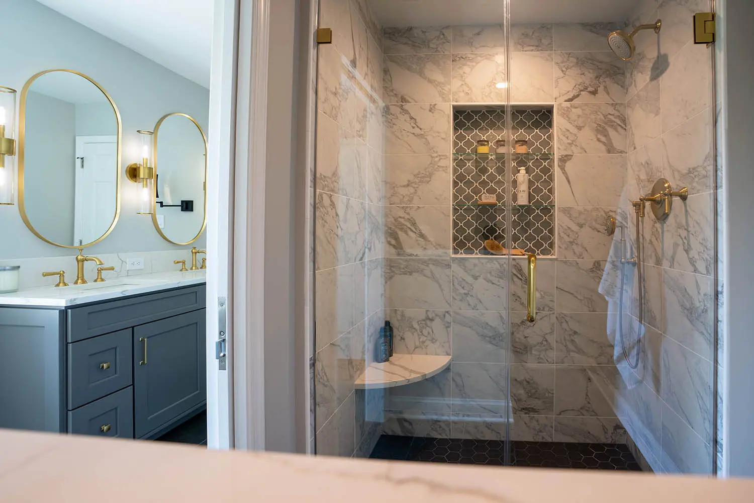 We began by removing the existing bathroom’s more dated and unnecessary elements — the bathtub, granite vanity top, and fun-but-not-spa-like world map shower curtain. The new shower is spacious and refined, with a glass door and walls, satin bronze fixtures, and a gorgeous niche perfect for storing all shower necessities. Eyes are drawn to the dark gray Varabesque accent tile, beautifully contrasting the light, marble-look wall tile.