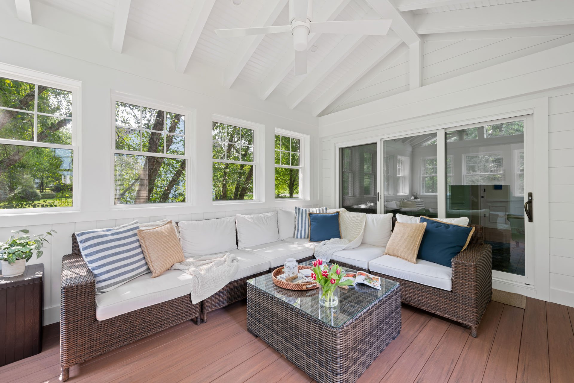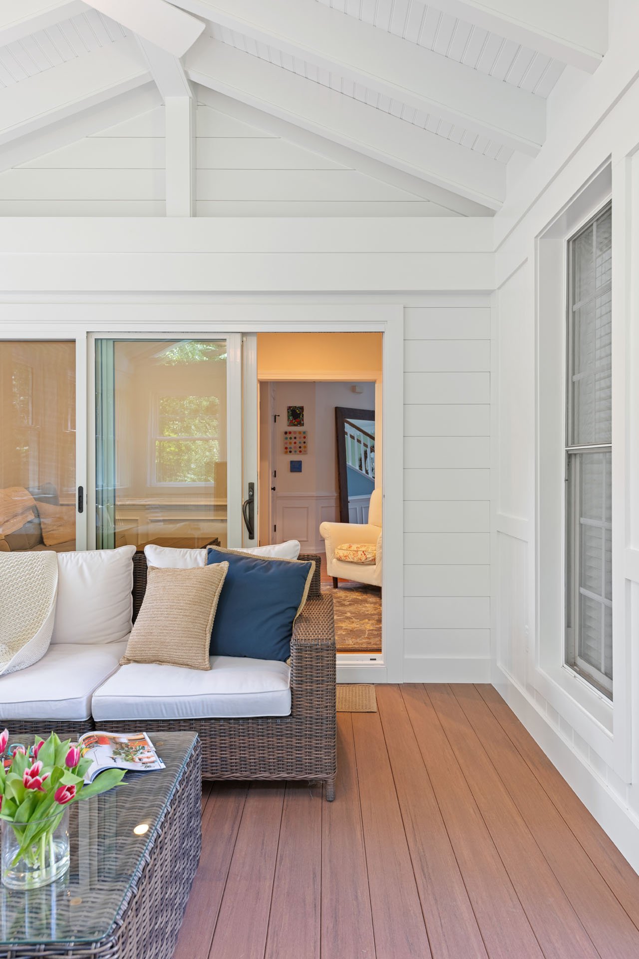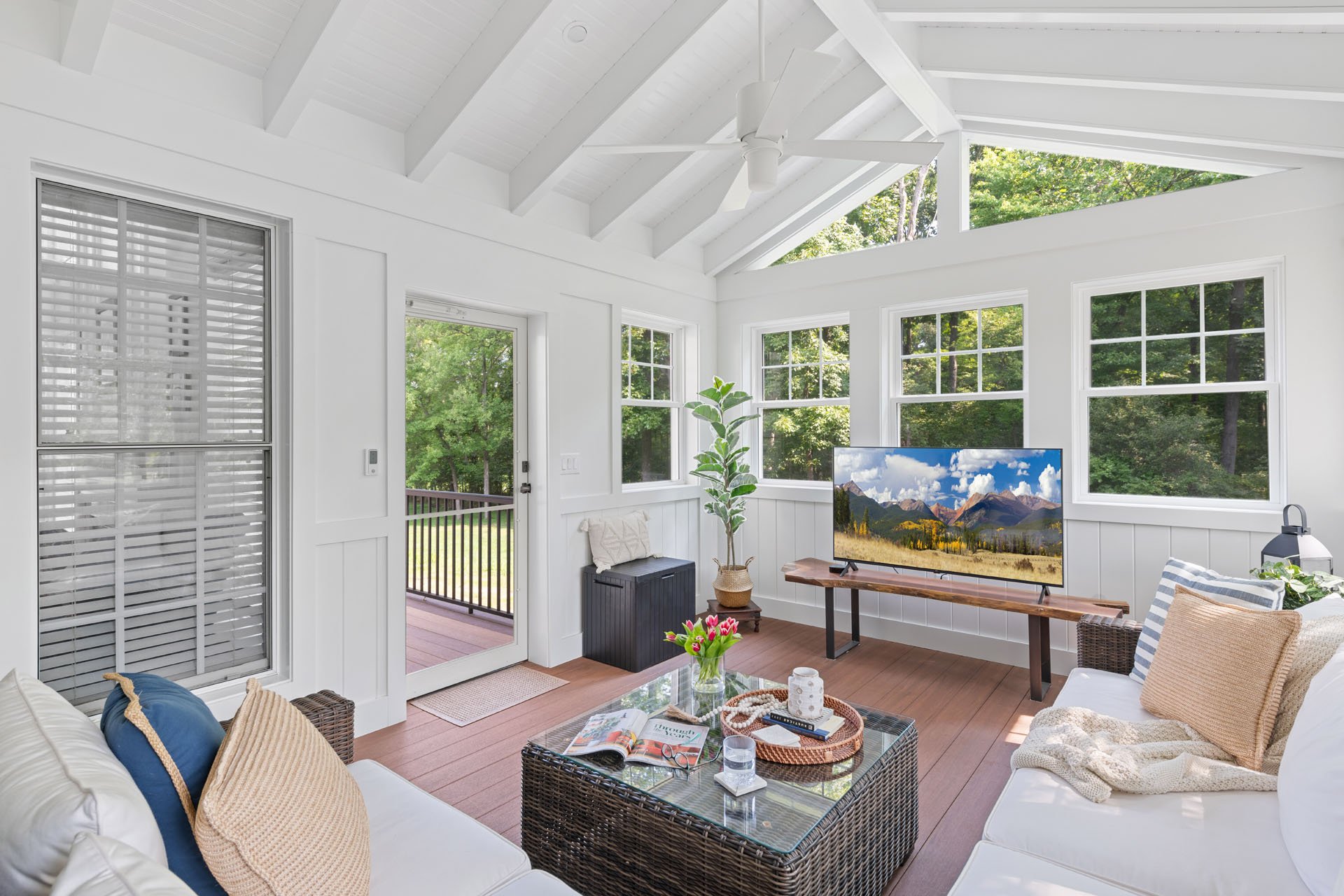The new three-season room is accessible through the home office, with wainscoting that matches other rooms of the house. The white and tan exterior coordinates with the existing siding, and custom gable triangle windows make the room feel spacious and bright. A ceiling fan ensures comfort as they enjoy a morning cup of coffee, watch the dogs play in the yard, or catch a Phillies game on the outdoor TV.