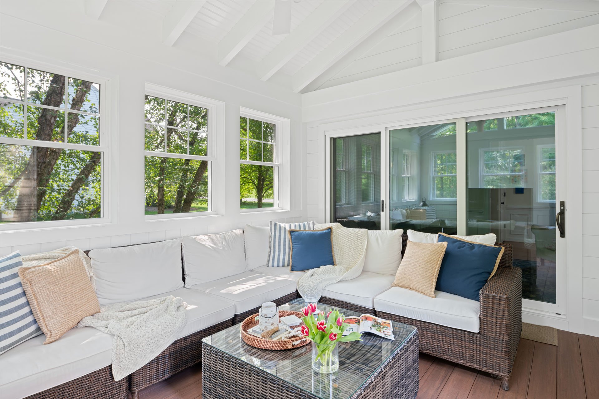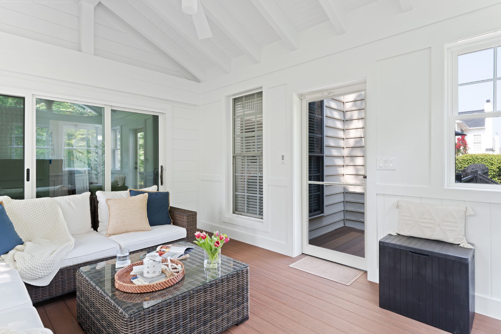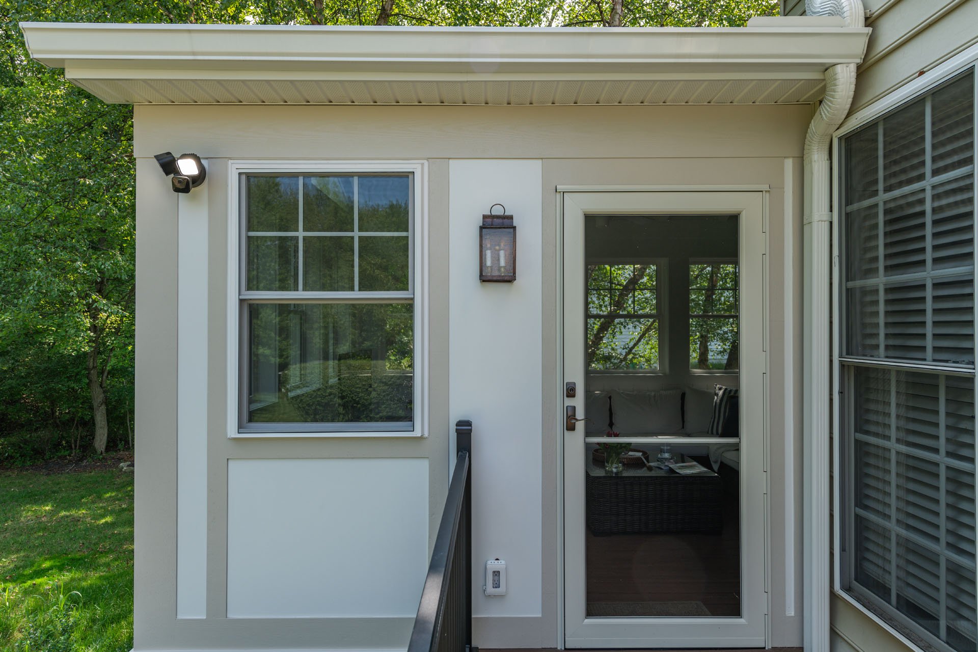 The new three-season room is accessible through the home office, with wainscoting that matches other rooms of the house. The white and tan exterior coordinates with the existing siding, and custom gable triangle windows make the room feel spacious and bright. A ceiling fan ensures comfort as they enjoy a morning cup of coffee, watch the dogs play in the yard, or catch a Phillies game on the outdoor TV.