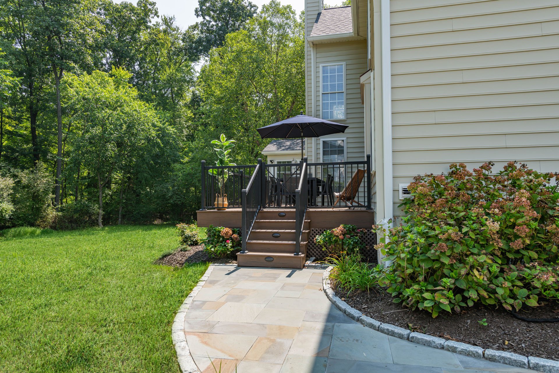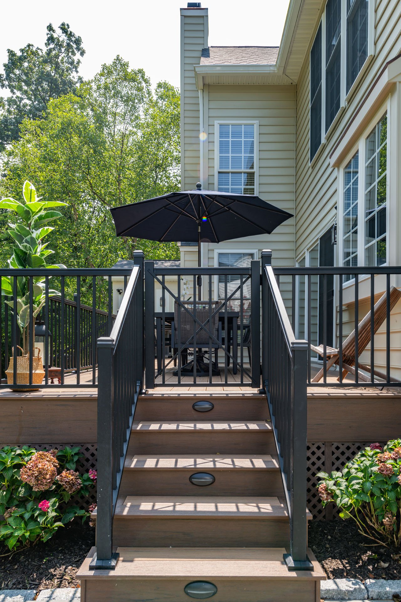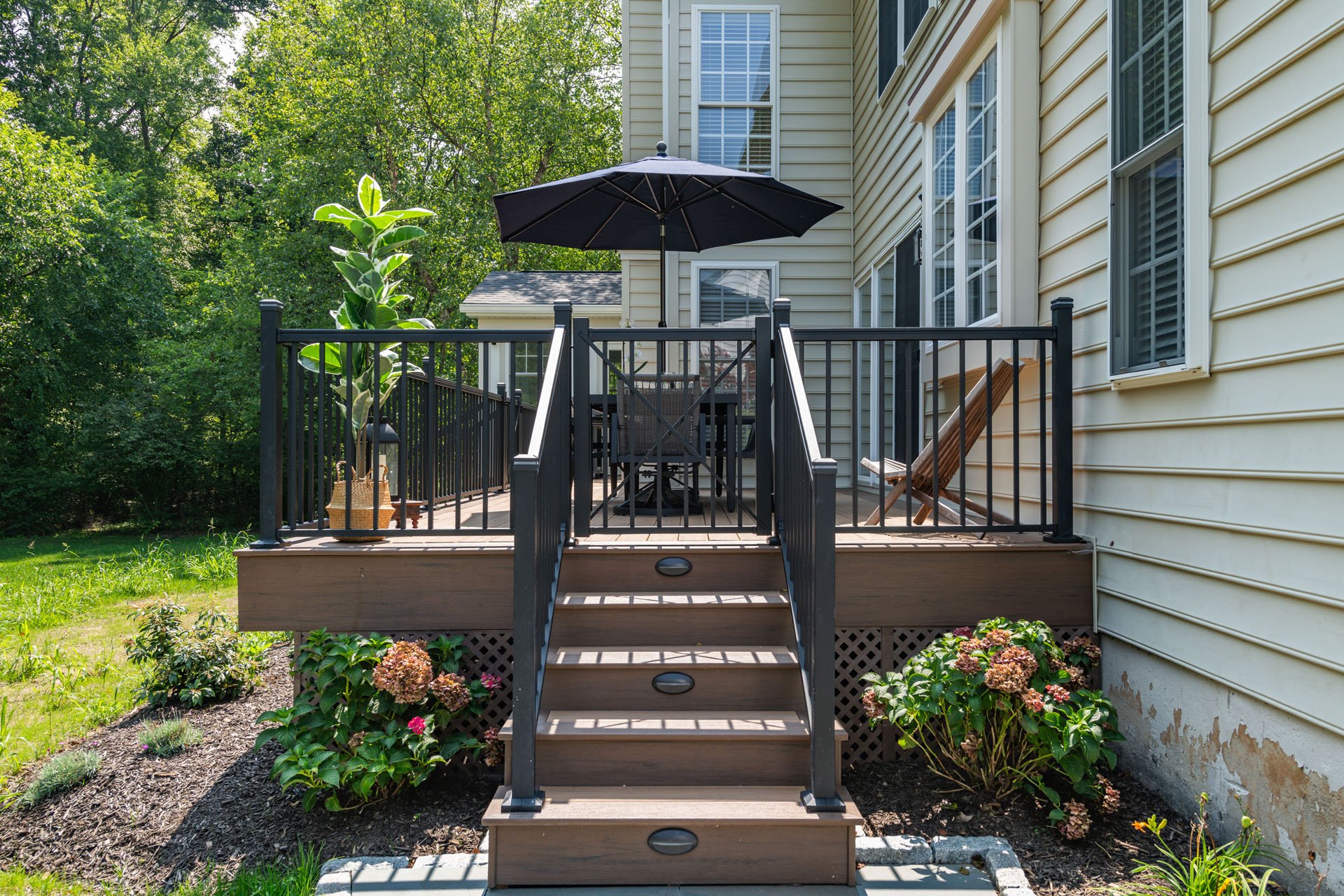 To tie in the deck, our team crafted a custom PVC lattice to run under both structures seamlessly. The two areas also have matching low-maintenance, durable Trex composite tongue-and-groove flooring designed to keep out insects and weeds. The deck is conveniently connected to the kitchen, so they can easily bring food outside to grill, or sit down to a meal with friends and family.
