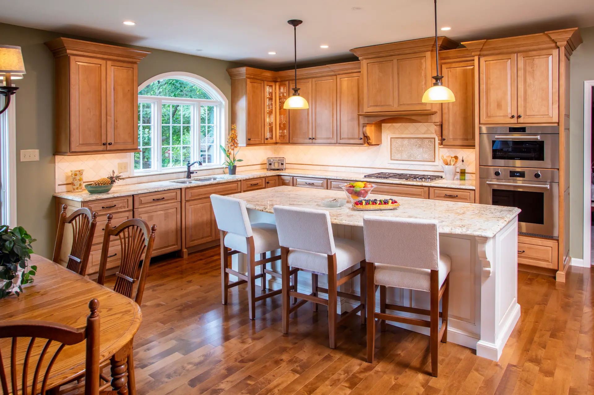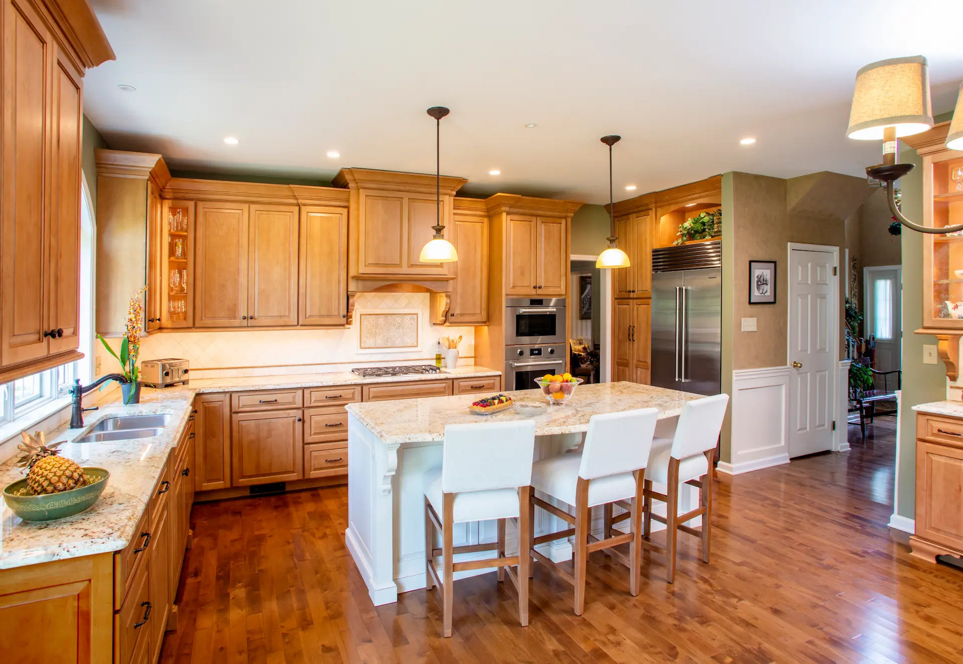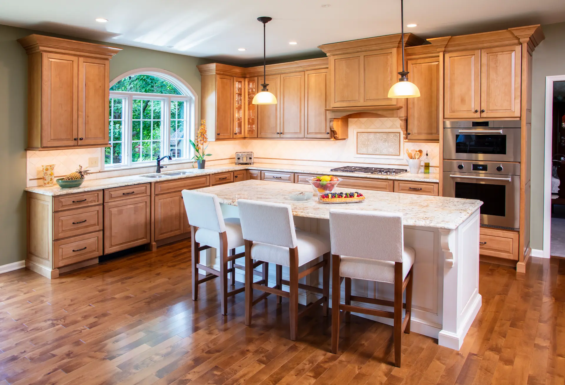The new kitchen layout required us to remove their old deck and bump out a portion of the exterior wall. We installed custom Kahle’s Kitchen cabinets throughout, including a pantry around the refrigerator. The large island has seating for four, making it a great place to congregate with family and friends. We also installed new windows with an arched transom to allow a better view into the backyard. Our clients are now happy to host friends and family in their new space.