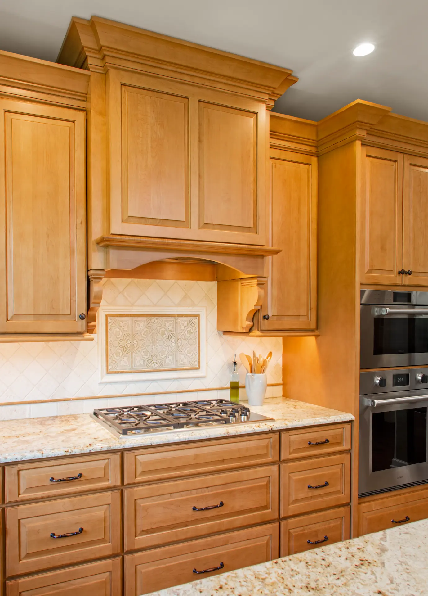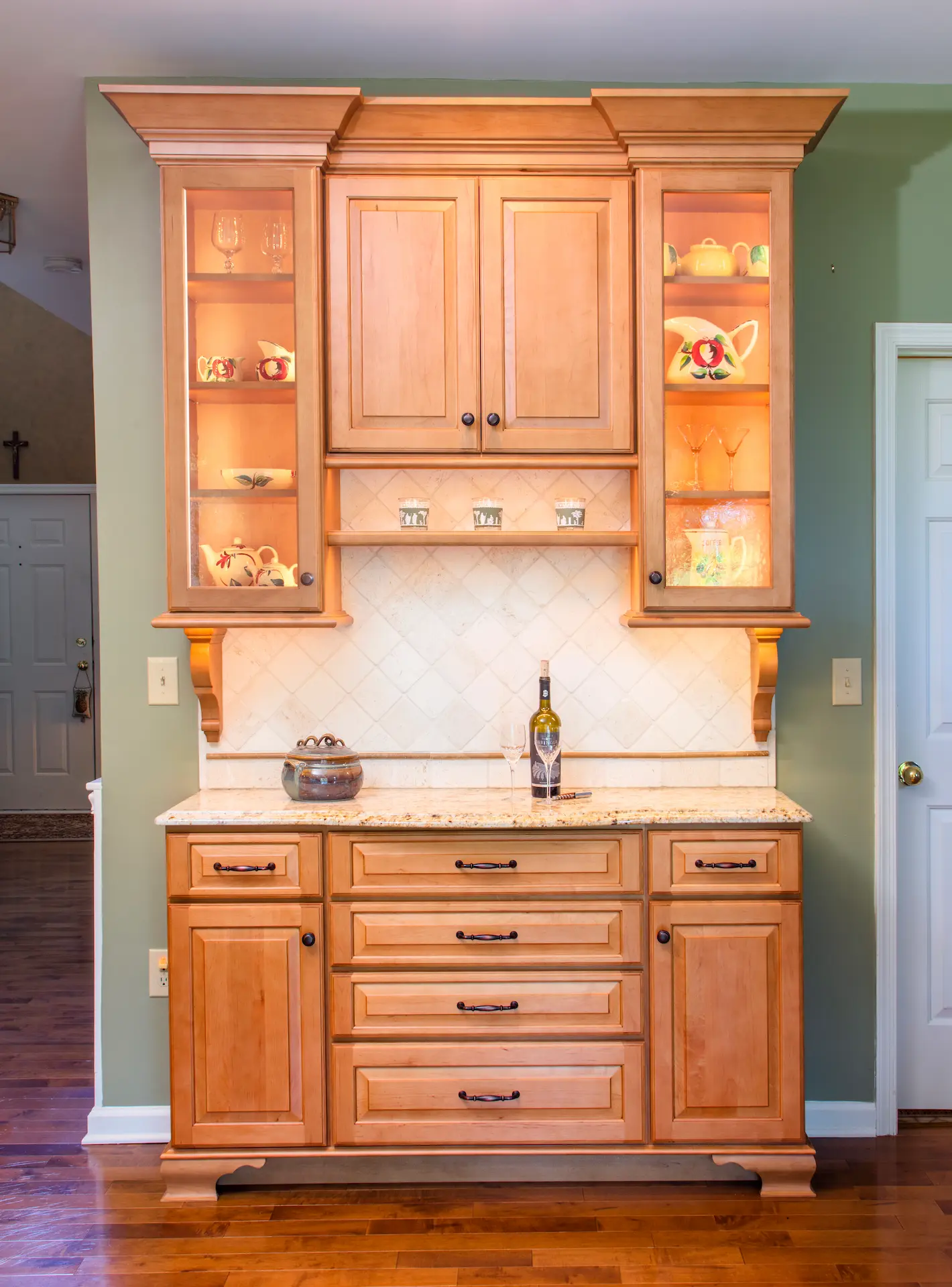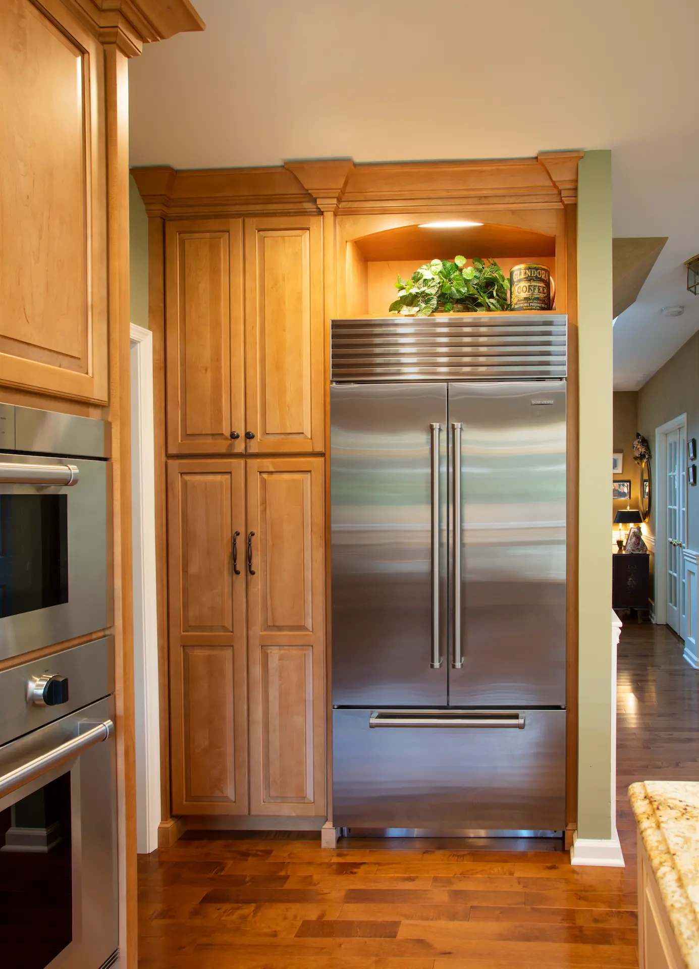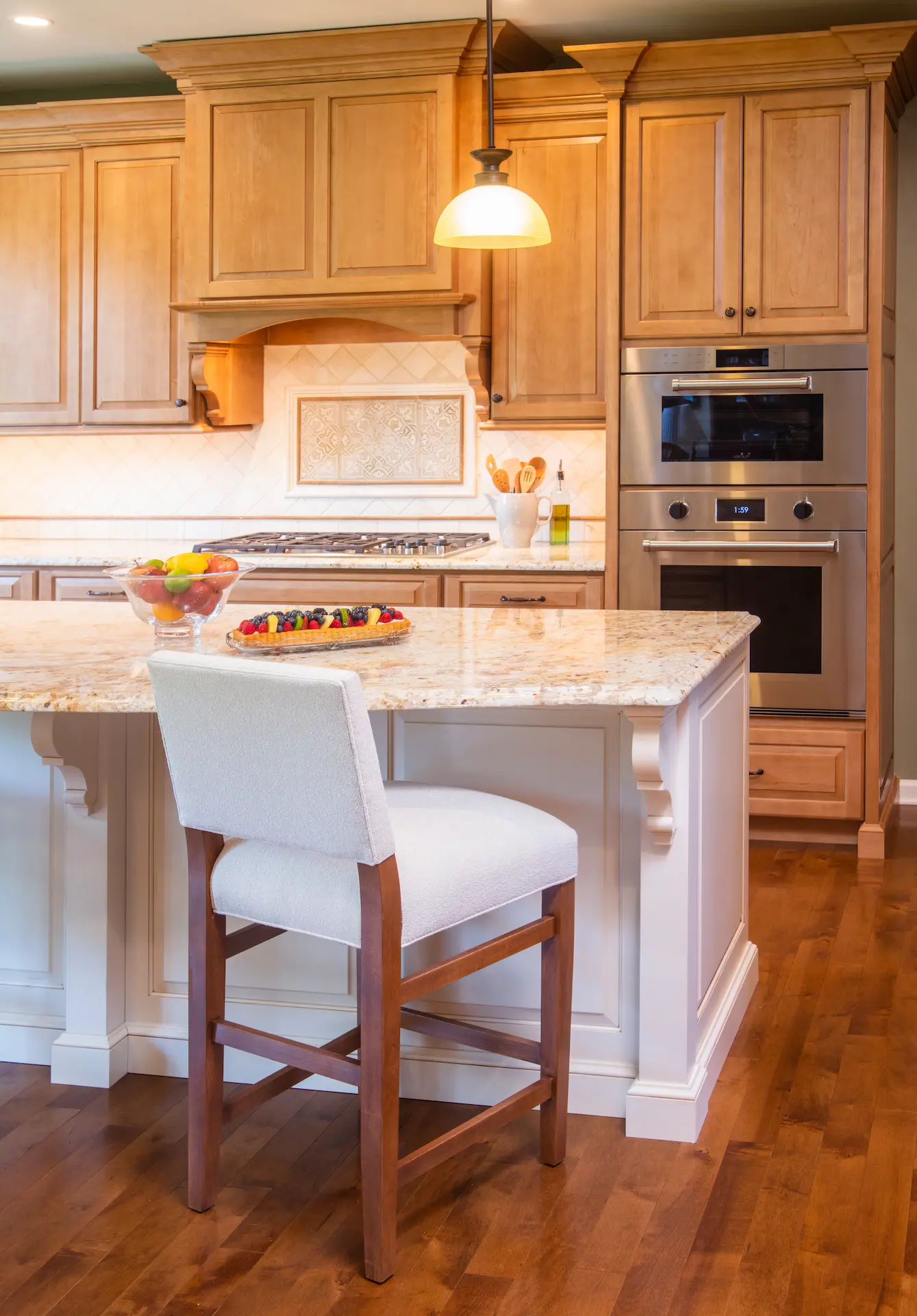 The new kitchen layout required us to remove their old deck and bump out a portion of the exterior wall. We installed custom Kahle’s Kitchen cabinets throughout, including a pantry around the refrigerator. The large island has seating for four, making it a great place to congregate with family and friends. We also installed new windows with an arched transom to allow a better view into the backyard. Our clients are now happy to host friends and family in their new space.