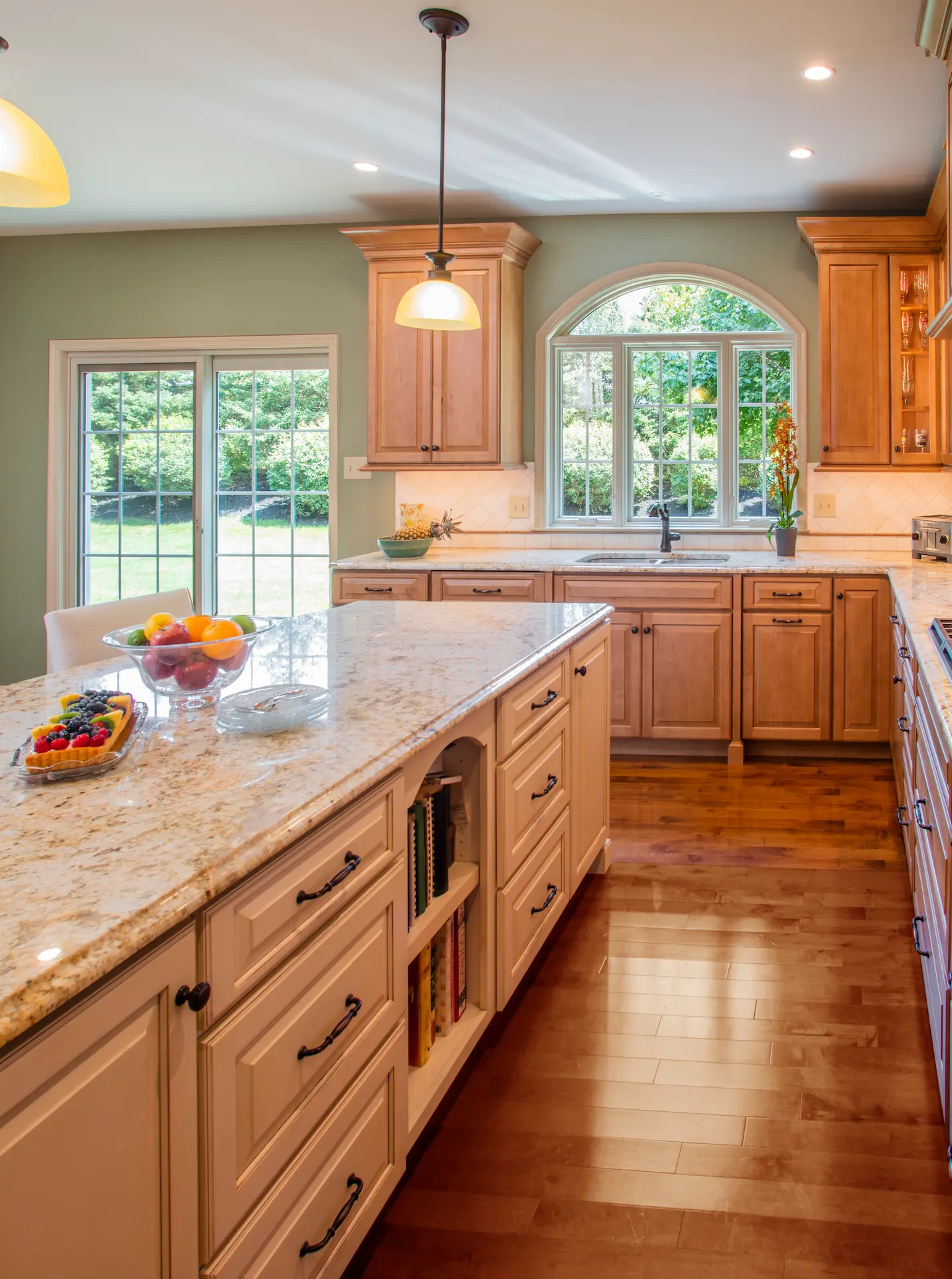 Our client’s original kitchen layout featured cramped pathways that lead to frequent collisions, as well as insufficient storage which forced items to be kept in other rooms. A top priority was to expand the footprint of the kitchen to accommodate a large island with seating and increase storage space. Our clients also wanted their new kitchen to have a better connection to the outdoors, as well as updated appliances.