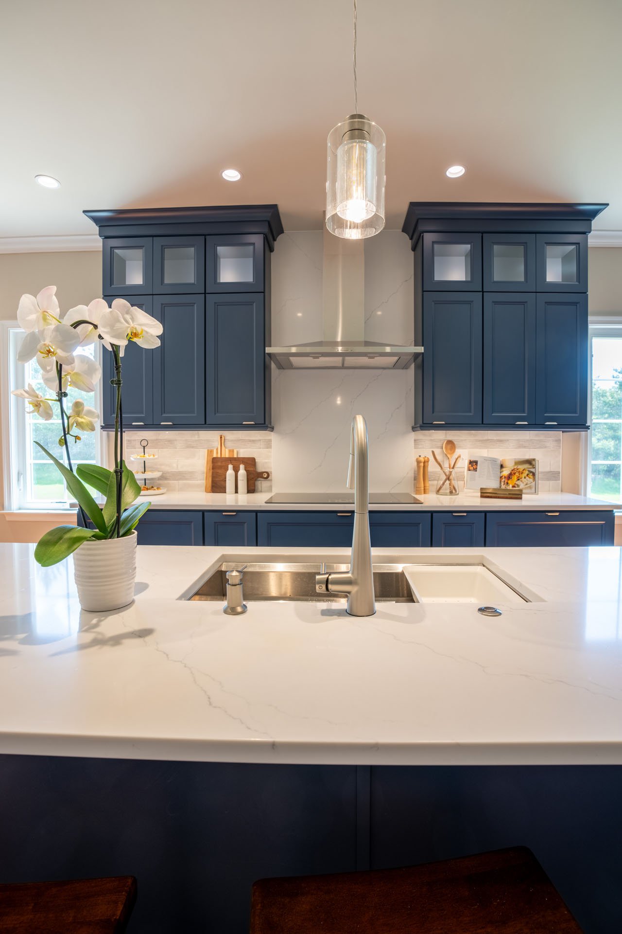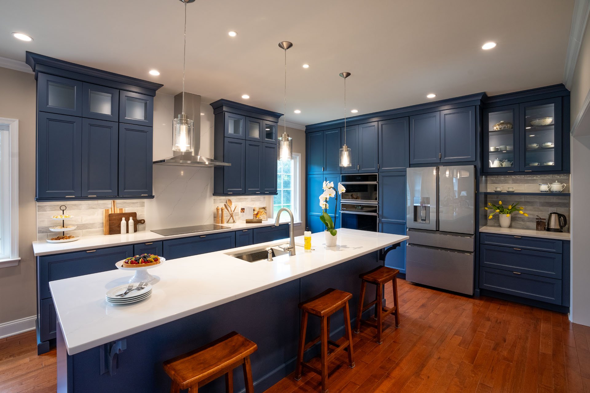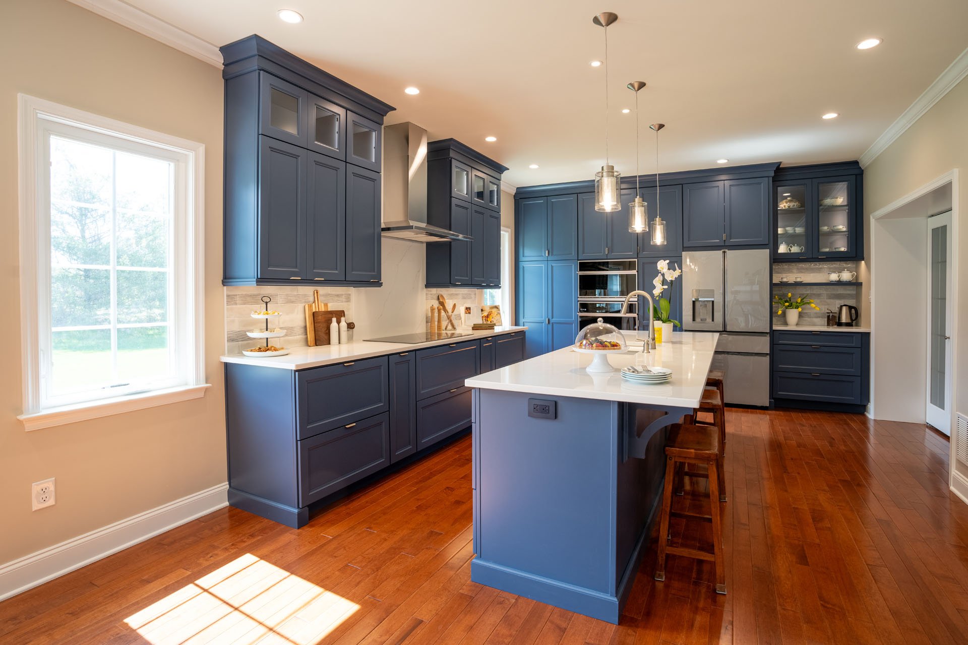 The new cabinets reach the ceiling and provide plenty of storage so everything can be put away and organized, and the family no longer has to deal with cluttered countertops. Glass doors at the top provide visual interest and an opportunity to showcase heirloom dishes. Below the countertops, convenient drawer storage is used for everything from pots and pans to spices and utensils. The generously open space and freshly painted walls allow natural light to pour in, creating the bright, welcoming kitchen this family hoped for.