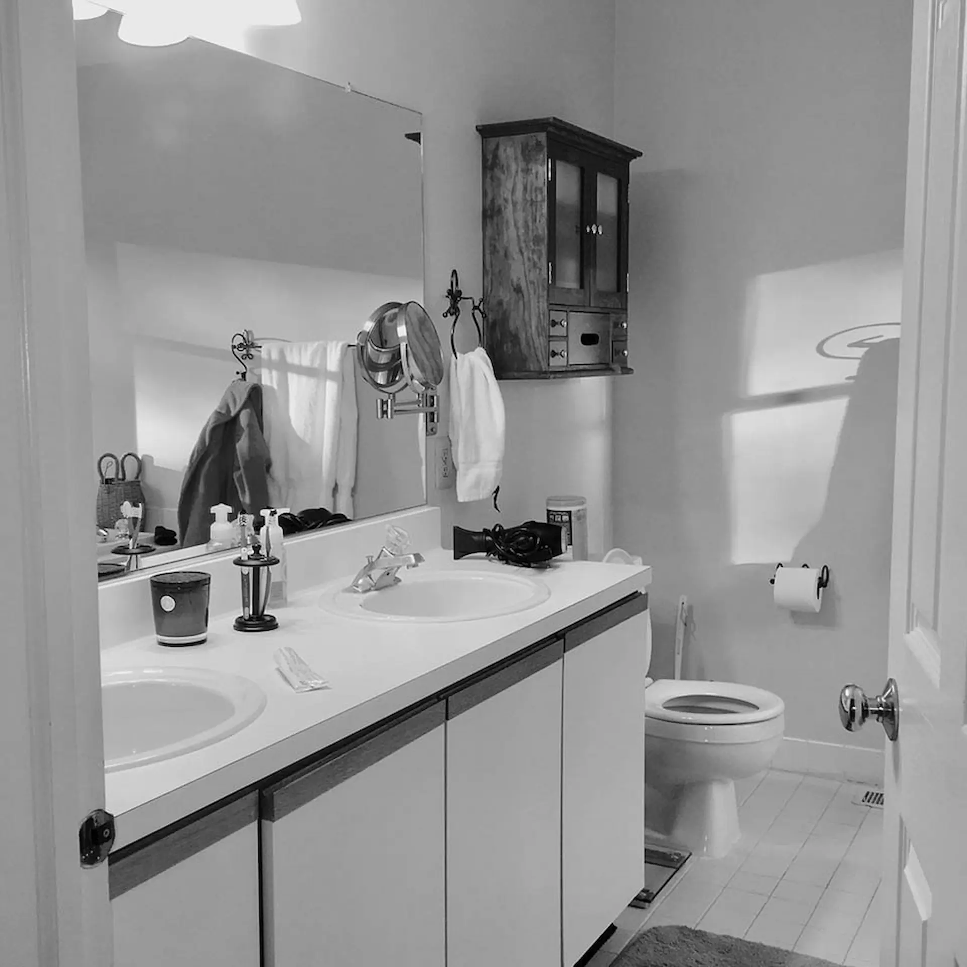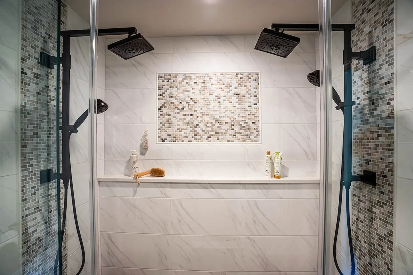 Though their cat may be the true star of the show, this bathroom is a close second! Removing the bathtub left room for a luxurious his & hers shower with dual rain showerheads. Heated floors, Calacatta gold quartz countertops, and a storage-filled double vanity complete the look for the ultimate spa-like experience.