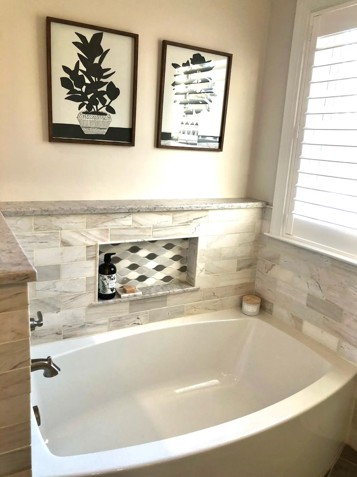 The oversized tub was removed and replaced with an elegant, curved alcove tub. With the newfound space, there was room for a spacious shower with glass walls to let in natural light. The upper portion of the wall dividing the shower and tub was removed, making the space feel more open and bright.